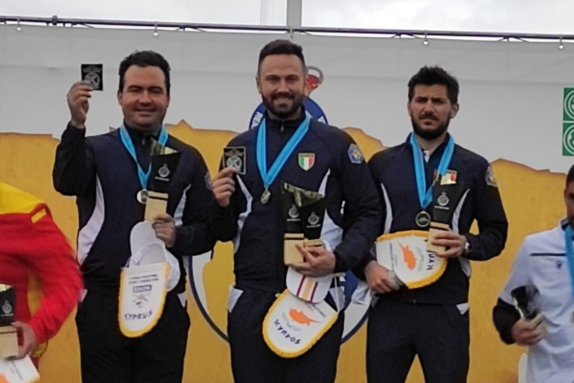 Gli azzurri Daniele Valeri, Davide Gasparini e Michael Spada al vertice del podio dei Men all’Europeo di Compak